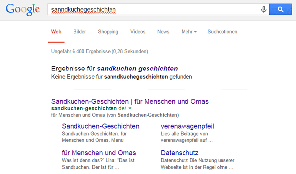 Aber es gibt ja noch das große Google. Dankenswerterweise führt das allwissende Suchorakel Menschen auf meine Webseite, die nach Sandkuchen-Geschichten in jeder nur erdenklichen Schreibweise suchen. Da weiß ich dann, dass die Menschen wirklich meine Geschichten gesucht haben. Danke dafür, Mama.