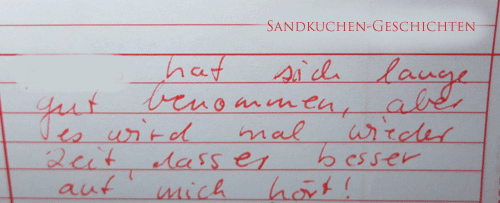 „Sie hat nicht gesagt, dass wir uns auch hinsetzen sollen.“, beschwerte er sich bei mir über den Eintrag mit folgendem Wortlaut: „Fritz macht Sachen immer wieder anders als andere Kinder – bitte reden Sie mit ihm darüber.“