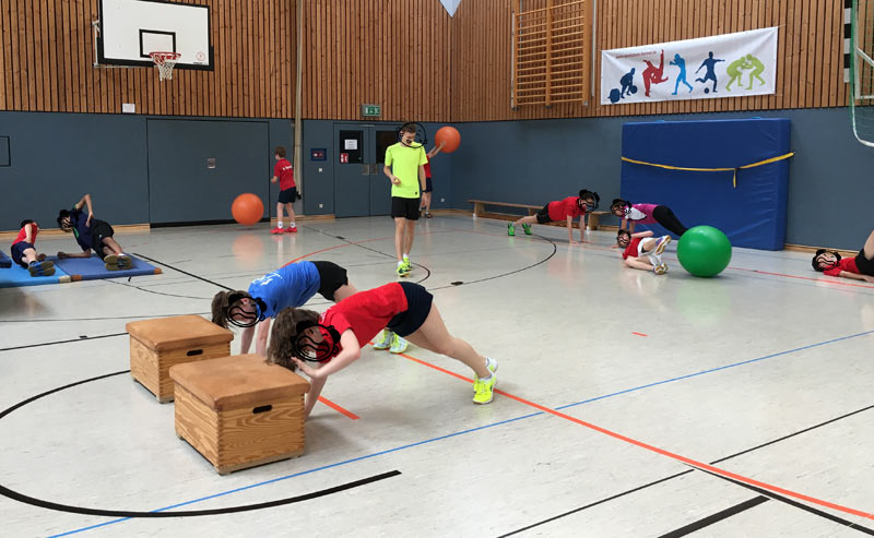 Weil es zu nass ist für draußen baue ich meinen Rumpfstabi-Kraftparkours halt in der Halle auf. Die Kinder freuen sich sehr. Und weil sie ihn so unmotiviert mitmachen, dürfen sie zeigen, dass sie sich in einer zusätzlichen Runde noch steigern können. Im Quälen spiele ich in einer Liga mit Felix Magat.