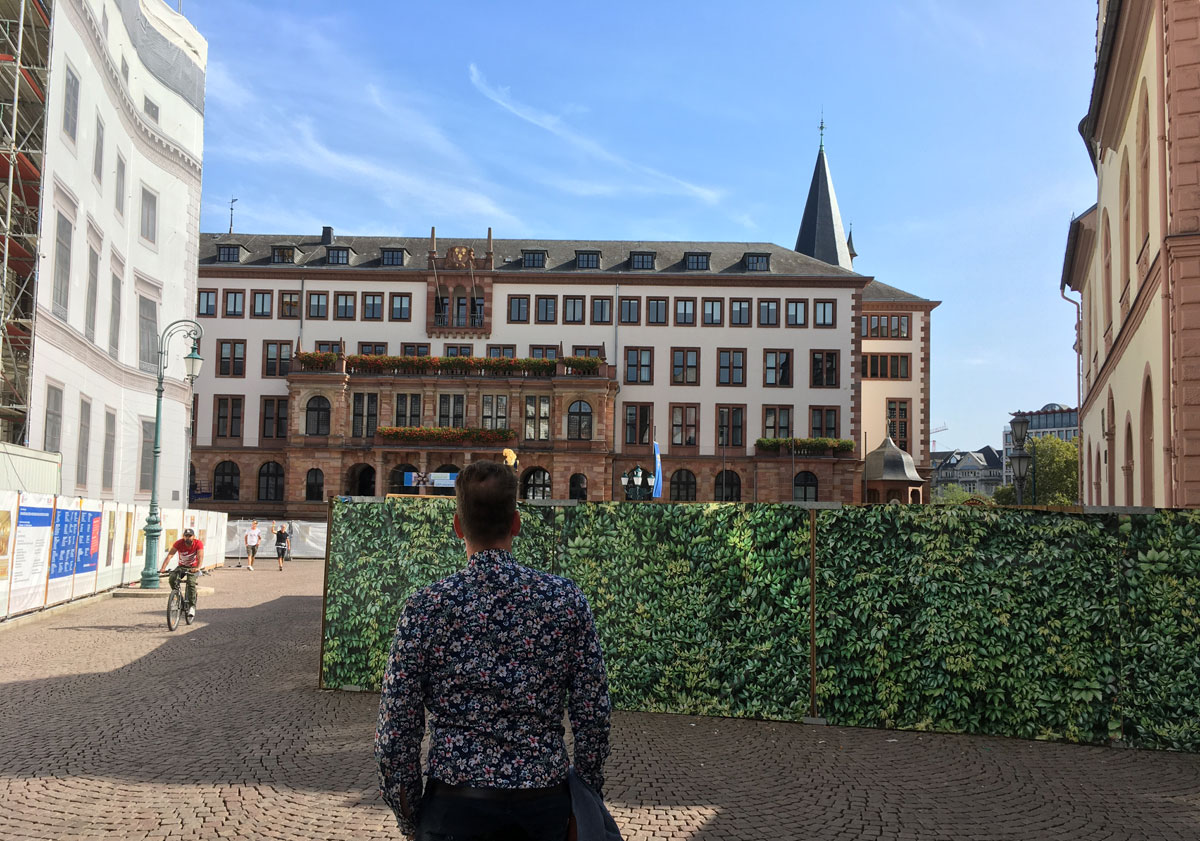 Fake-Wiesbaden. Offensichtlich hat Christo kurz vor seinem Tod noch Wiesbaden eingepackt. Der Lieblingsmann fügt sich mit seinem Blümchenhemd jedenfalls sehr gut ein vor der falschen Hecke.