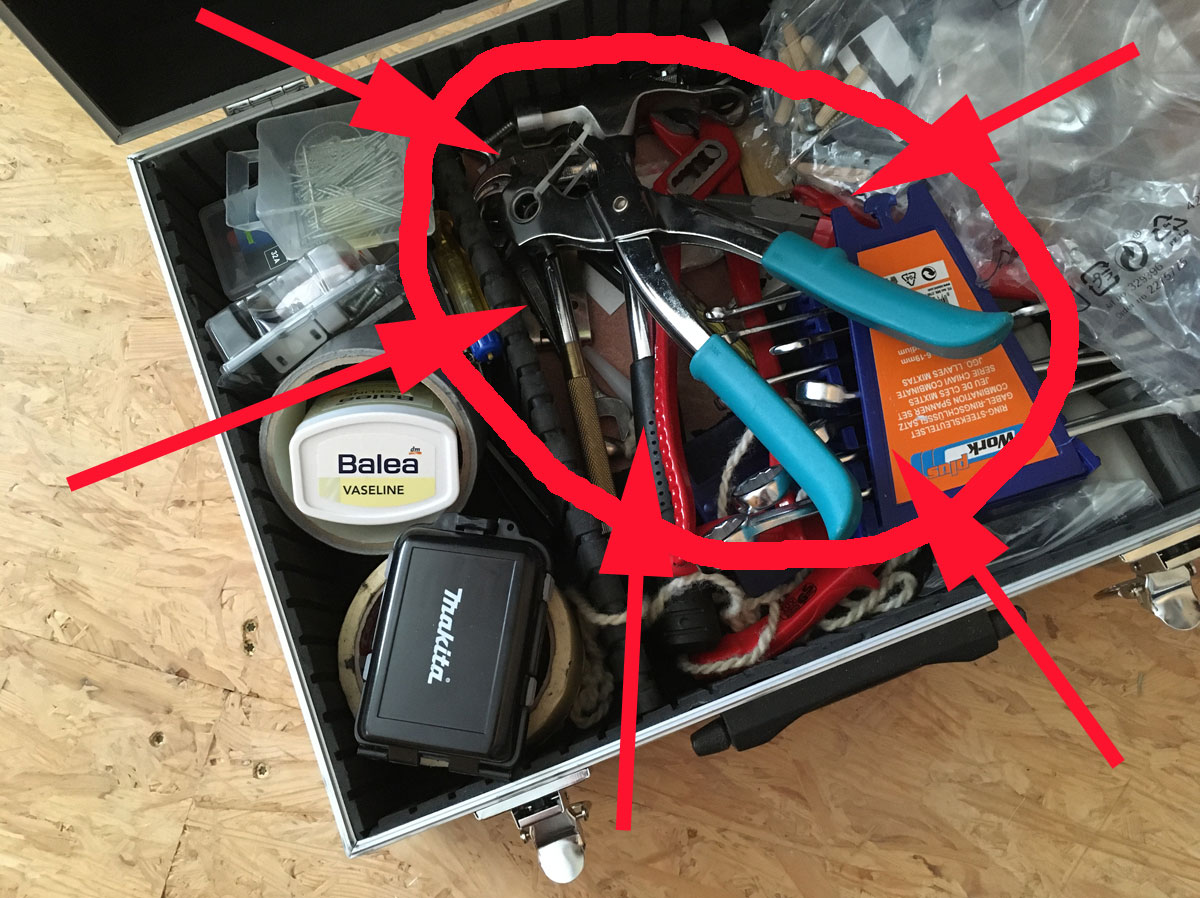 Neben der Nähmaschine steht seit gestern der offene Werkzeugkoffer und ich frage mich, wie laut die Lochzange noch „Hallo, hier bin ich!“ hätte rufen sollen.