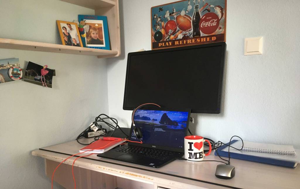 Der Yogaraum hat ein neues Item bekommen: Da es in diesem Haushalt jetzt neben dem Gaming-Stuhl auch einen 1-a-Gamingschreibtisch mit so nützlichen Features wie einem über die komplette Schreib(Hahah)-Fläche reichendem Mousepad, einer Controller-Ladestation und einem Getränkehalter für große Gebinde Energy-Drink gibt, ist ein ausrangierter Schreibtisch für mein „Mobiles-Arbeiten-Office abgefallen“, so dass ich mein Work-Setting nicht mehr im Esszimmer aufbauen muss.