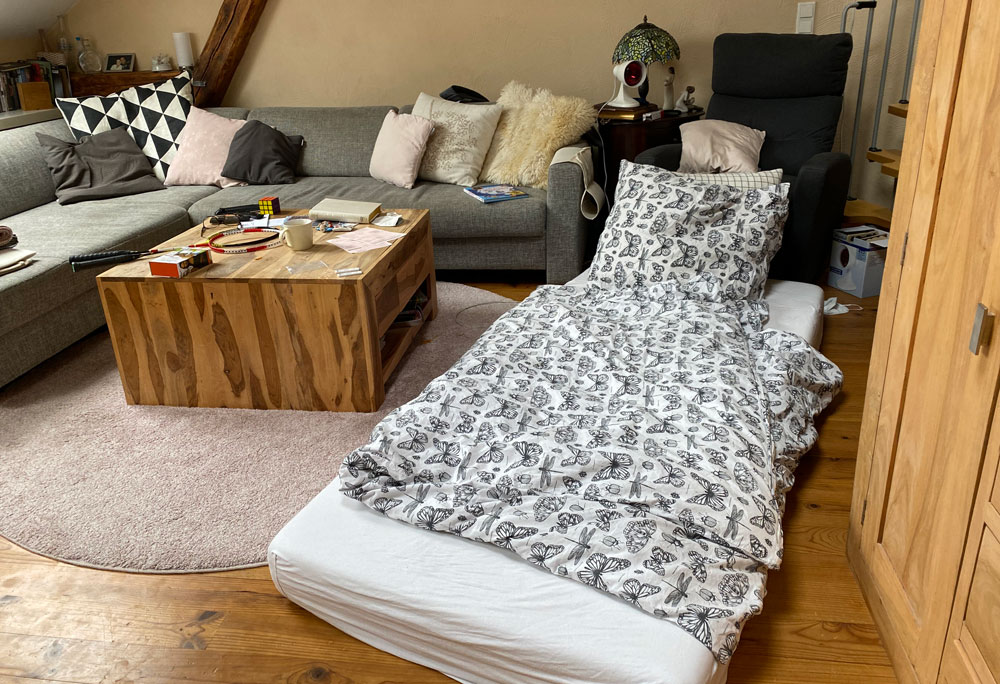 Ach, und dann ist diese blöde Pandemie ja immer noch nicht vorbei. Meine persönliche allerdings schon, denn heute verschwindet die Matratze aus dem Wohnzimmer, auf der ich jetzt zwei Wochen übernachtet habe, nachdem der Sohn als Souvenir von seiner Klassenfahrt einen zweiten Strich auf dem Test mitgebracht hatte und mir freundlicherweise auch ein paar Viren überlassen hatte.