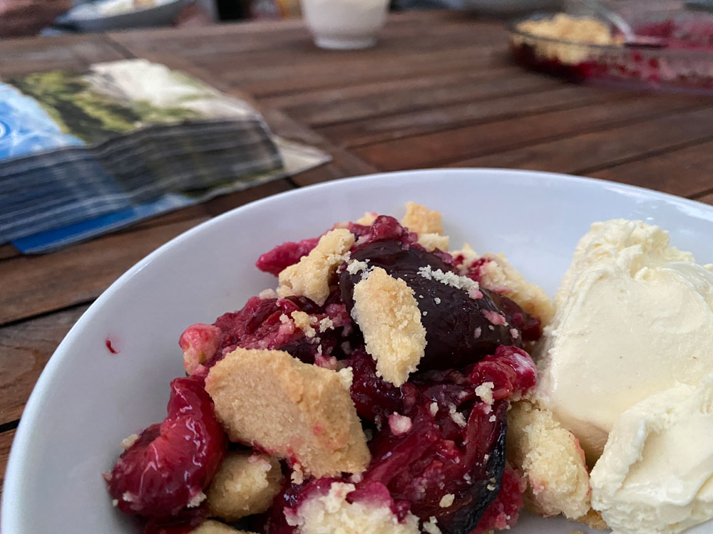 Weil wir nachmittags ja gestrichen haben, gibt es den Zwetschgen-Crumble halt zum Nachtisch zusammen mit Eis von der Eisdiele nebenan.